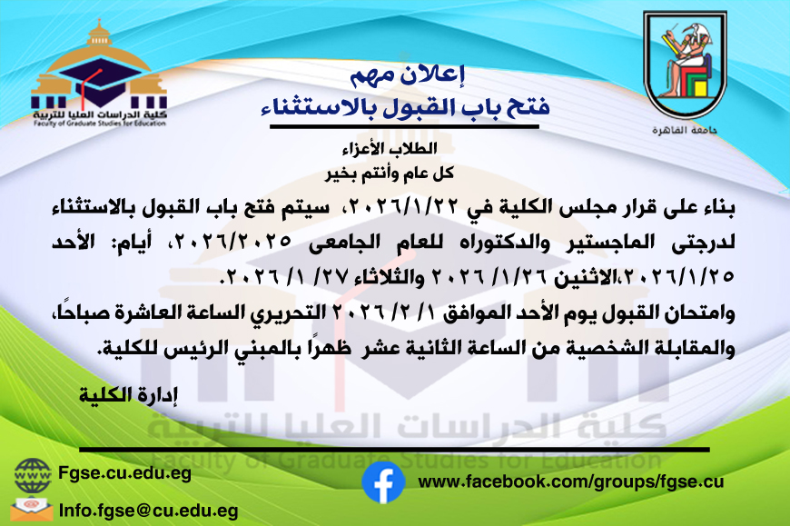 "تسعي كلية الدراسات العليا للتربية لتكون بيت خبرة متخصص في الإعداد والتنمية المهنية للمعلم، وترقية البحث التربوي من أجل التميز التنافسي أكاديميا ومهنيا، والتجديد والقيادة والريادة في مجتمع التعليم، والتعلم المستمر مدى الحياة".