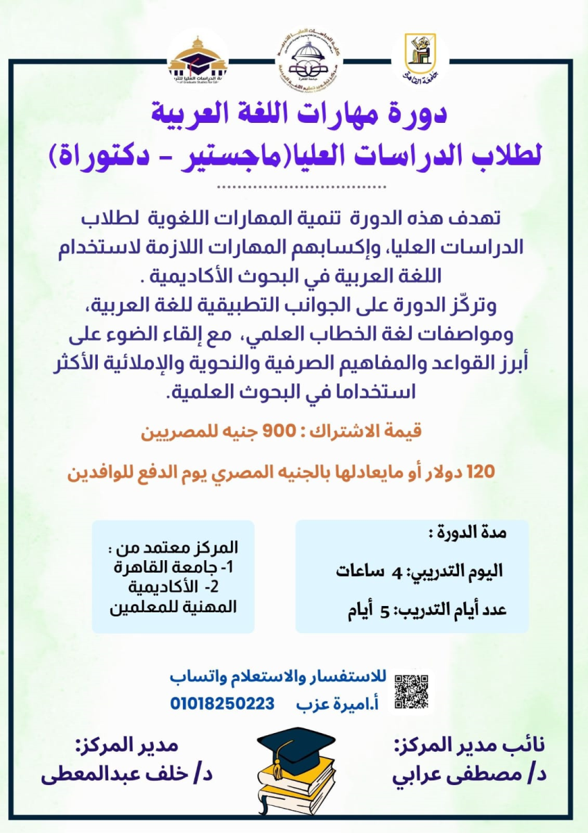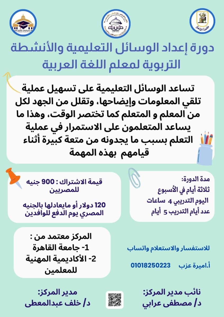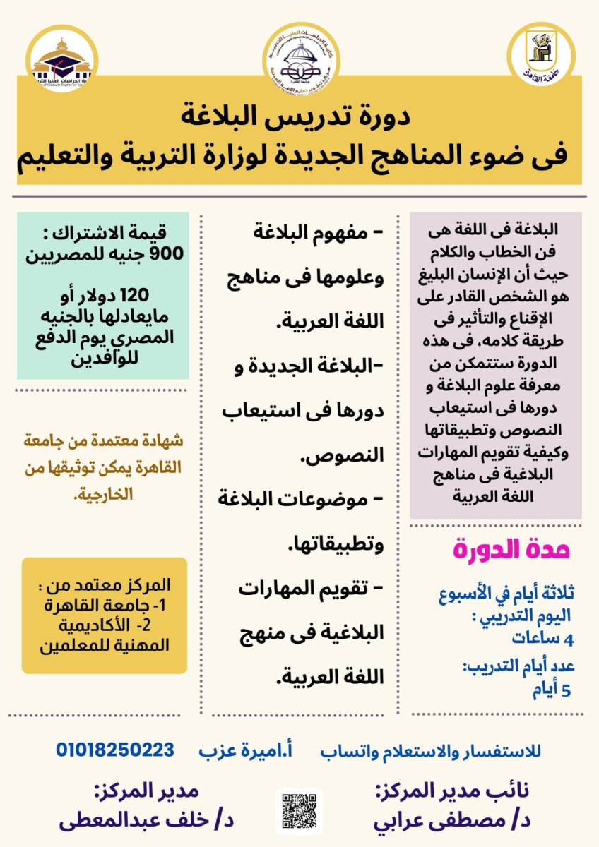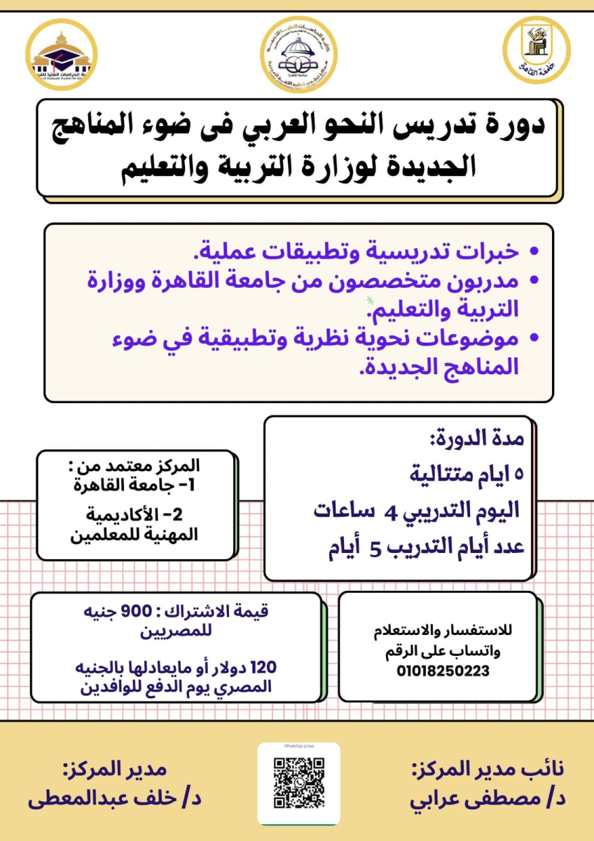 · دورة التأهيل التربوي لمعلمي اللغة العربية بالمرحلة الثانوية والإعدادية في ضوء المنهج الجديد لوزارة التربية والتعليم.