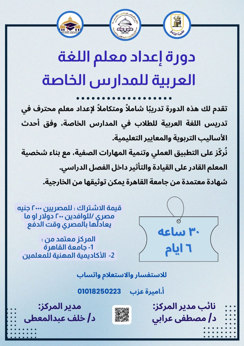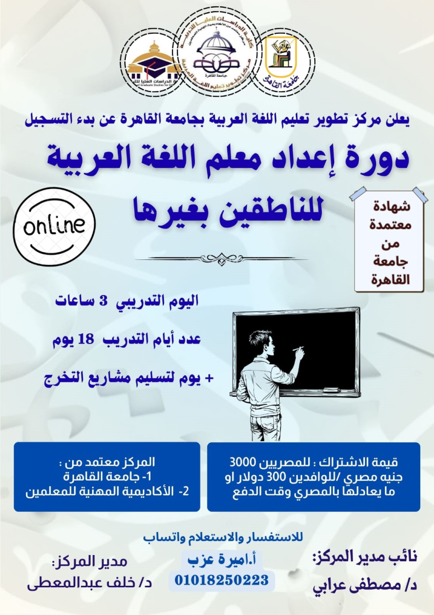 · برنامج إعداد معلم اللغة العربية للناطقين بغيرها (الخمسة مستويات متتابعة) 75 ساعة تدريبية بما يعادل 25لقاء أون لاين و15 لقاء وجها لوجه.