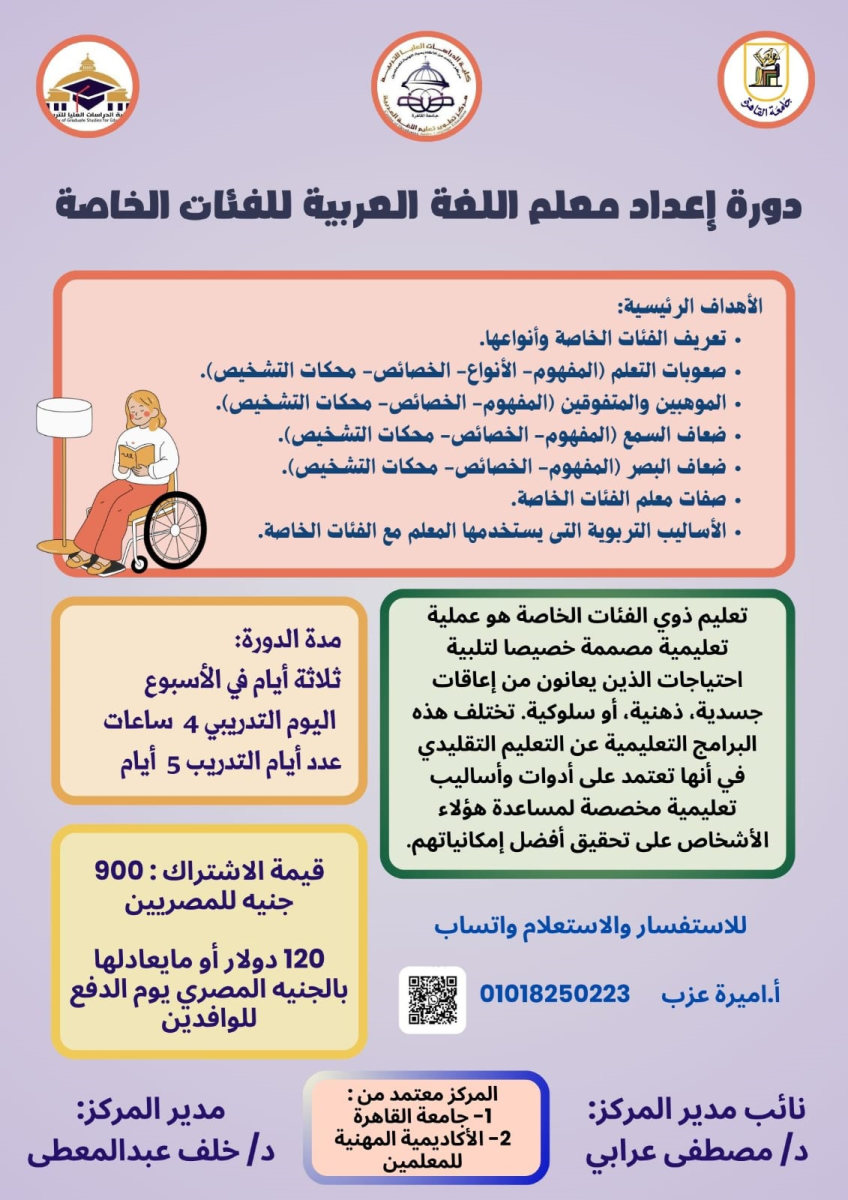 · دورة إعداد معلم اللغة العربية للفئات الخاصة (الموهوبين – ذوي الهمم – صعوبات التعلم) بالشراكة مع مركز الإرشاد النفسي بالكلية.