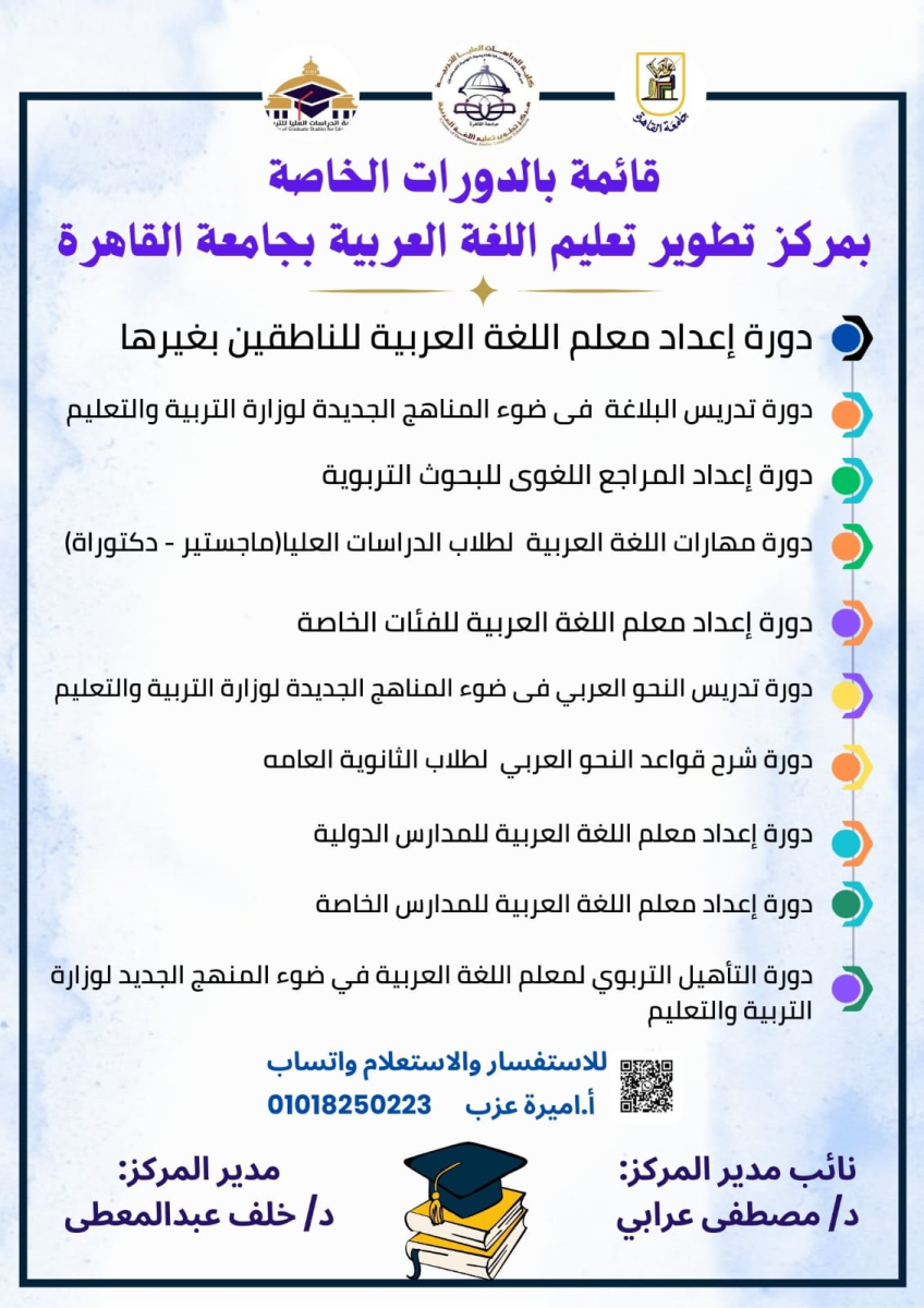 · تنظيم وإعداد دورات تدريبية لمعلمي اللغة العربية في مختلف التخصصات البينية (المدارس الدولية - الفئات الخاصة).